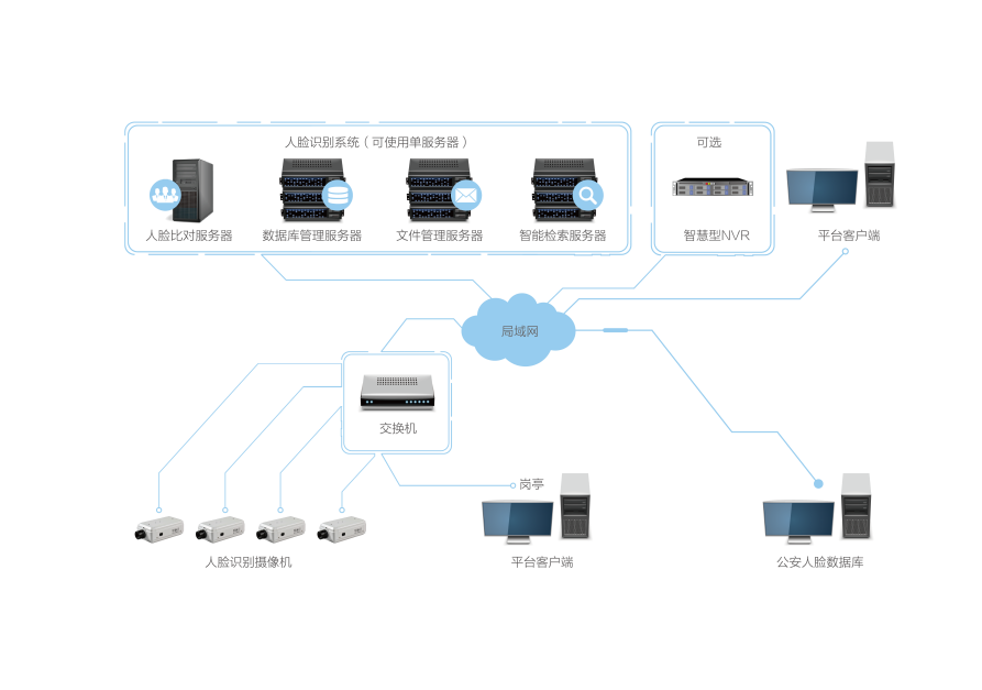 系统由前端人脸抓拍摄像机、人脸比对服務(wù)器、存储设备、人脸数据、智能(néng)检索服務(wù)器、人脸识别系统平台组成,完成对人脸进行自动捕获、跟踪、抓拍等功能(néng),支持黑白名(míng)单应用(yòng),黑名(míng)单实时报警、人员活动轨迹分(fēn)析追踪、各种报警信息排查、图像的预览检索、相关场景图预览等;